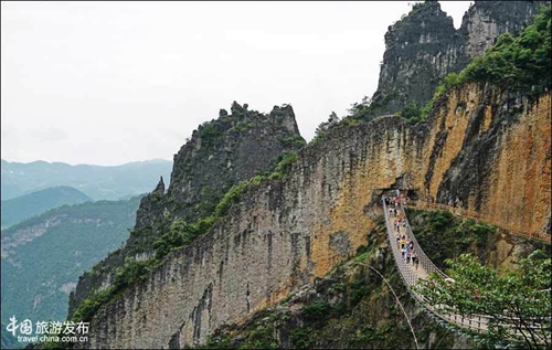 武陵山大裂谷海拔从1980米到600米,巅峰到谷底间的落差达700米,从景区大门进入,一直是下山路,从如刀劈斧砍的峭壁处穿天门洞过索桥,沿阶而下,越往下越觉凉爽,再转过一个弯,俯瞰山下,是一处平坦之地,不知道是否就是当年巴人居住的桃花源。
