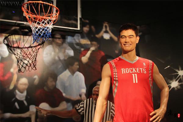 终于来到了全馆最高的一尊蜡像了,这就是前几天正式进入NBA名人堂,亚洲首位状元秀,休斯敦火箭退役巨星姚明了。站在姚明的蜡像旁,一个字高!这等高的蜡像最大的好处就是能让游客和明星们比比肩。在姚明面前,我推荐的照相方式有,投篮,或者是和姚明比高!没错,就是和姚明比高,虽然这明显是自黑行为,但非常有趣,不信,看看这几图。