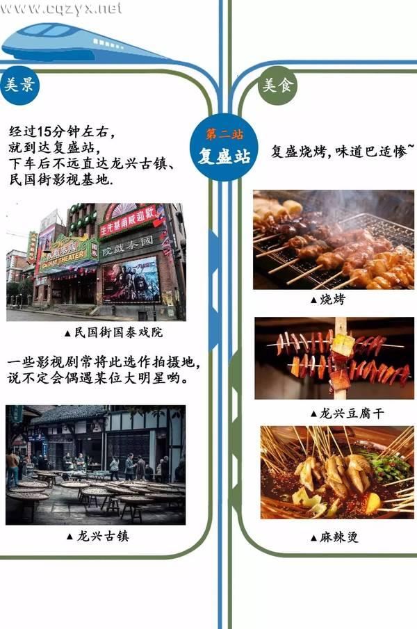 距离复盛站15分钟左右车程有龙兴古镇及其附近的重庆民国街。龙兴古镇是重庆历史文化名镇之一,国家3A级旅游景区。古镇建筑保存完好,共有八大群体序列七十余处文化遗址,典型建筑有古庙、古寨、祠堂、老街民居等。重庆民国街二期工程目前正在升级打造中,预计明年开放。届时市民可欣赏到复建的新华日报、朝天门码头等抗战时期重庆地标性建筑。