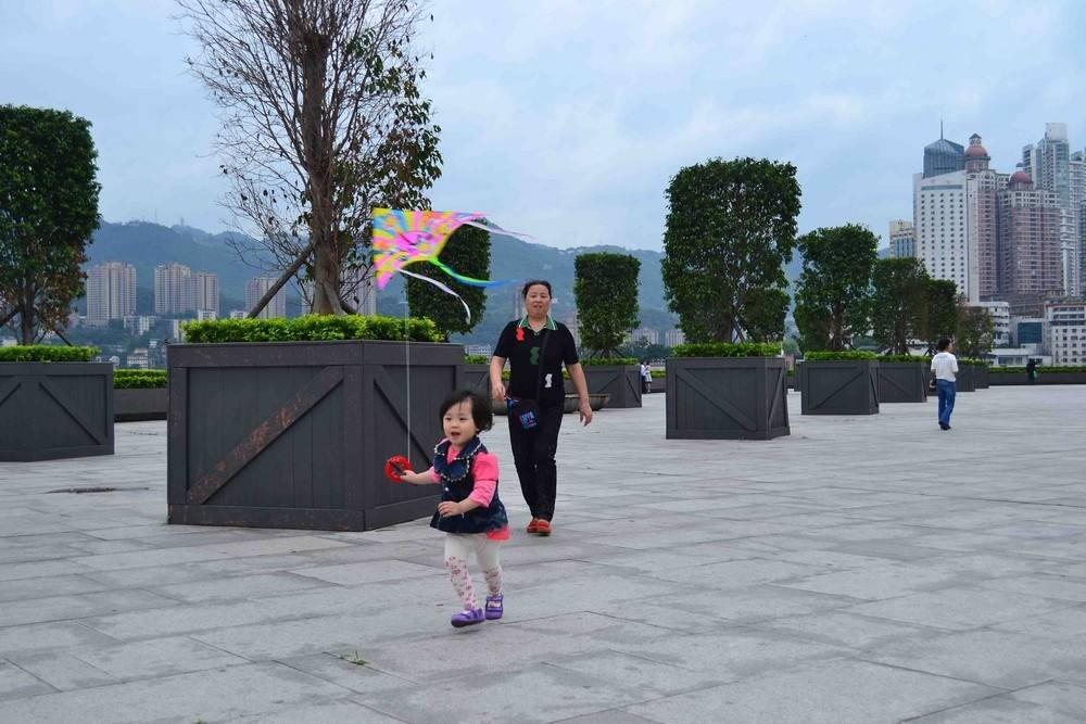 中央公园地处寸土寸金的江北嘴中央商务区,是主城区最精致的一块“碧玉”。中轴线中段有一条与之交叉的横向步道,叫做桂花街。街上两座风格各异的教堂相映成趣,前面一座浅色的天主教堂名为福音堂,后面一座深灰色的基督教堂叫德肋撒堂。多年前,两座教堂曾是老江北城的亮点,这次它们在中央公园内得到“重生”。人们除了可以到大剧院看两江,还可以在公园内开阔的草坪上晒太阳、放风筝,在园内及周边骑自行车。在这种环境里放风筝,心情不舒畅都难。