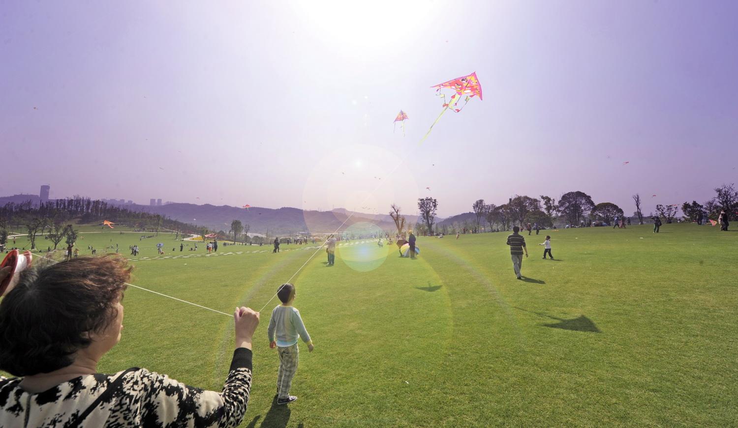 内陆最大的开放式城市中心公园—重庆中央公园。得天独厚的条件引得一众风筝爱好者蜂拥而去。进园无需门票,不允许私家车进入,但是在东、西、南三个入口方向都有地下停车位,在300亩的草坪上躺着放风筝,真是惬意。